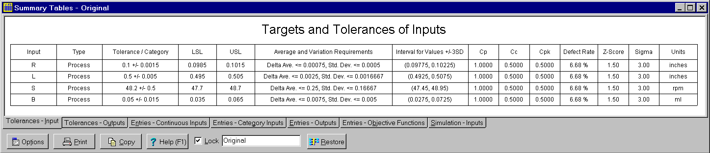 Tab 1 - Tolerances Inputs: Displays specified tolerances and settings for all continuous input variables and category input variables showing the same information that is displayed on the tabs in the Continuous Input Variable dialog boxes and in the Category Input Variable dialog boxes.
