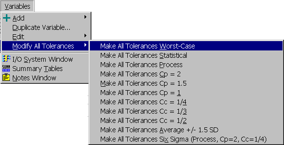 Make All Tolerances Cc = 1/2 Sets the Average Delta Upper and Average Delta Lower fields of all continuous input variables to "(USL-LSL)/4" which results in a Cc of 1/4.
