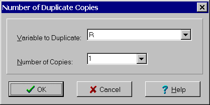 The Number Duplicate Copies dialog box is used to make duplicate copies of a variable. It saves times when there are a large number of similar inputs that must be entered. It is displayed by selecting the Duplicate Variable... menu item from the Variables menu. The dialog controls are: