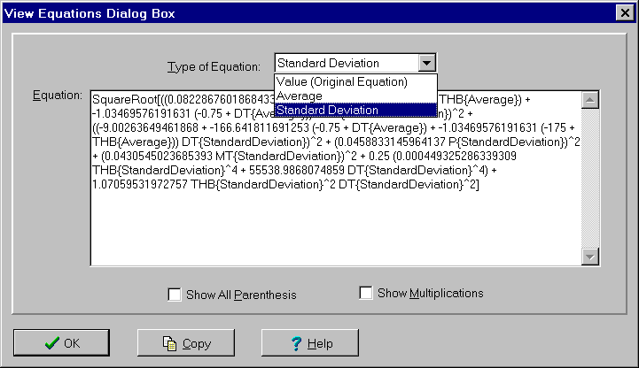 Equation edit box: Displays selected equation. Cannot be used to edit the equation. To copy the full equation to the clipboard, click the Copy button.
