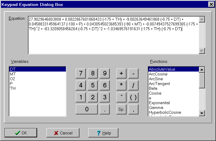 Used to enter an expression for an output variable or objective function. While the equation can be typed directly into this edit box, it is easier to enter it by double clicking on the variables and functions below as well as clicking on the character keys.