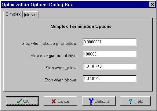 To close the dialog box and save the changes, click the OK button. To cancel the changes, click the Cancel button, press the Esc key or click the X in the upper right corner of the dialog box. To restore the stopping criteria to the default values, click the Defaults button. For help, click the Help button or press the F1 key.