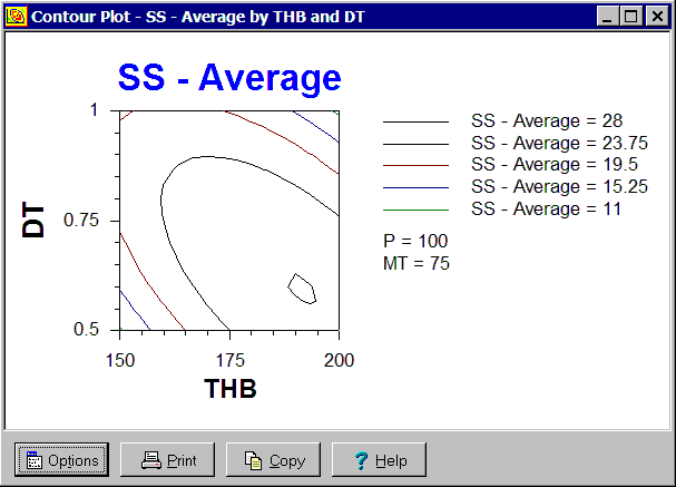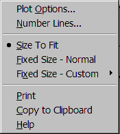 Clicking this button displays the popup menu below associated with this window. This popup menu has menu items that correspond to each of the buttons and controls shown at the bottom of the window. In addition, the Plot Options menu item displays Plot Options dialog box for changing the appearance of the plot. The Number Line menu item only appears on interaction and contour plots and is used to change the number of lines displayed. The remaining menu items can be used to change how the graphic is sized within the window. A short cut is to right mouse click on the graphic.