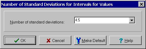 The Number Standard Deviations for Intervals for Values dialog box is used to change the number of standard deviations used to calculate intervals for values. It is displayed by selecting the Number Standard Deviations for Intervals for Values... menu item from the Options menu. The dialog controls are: