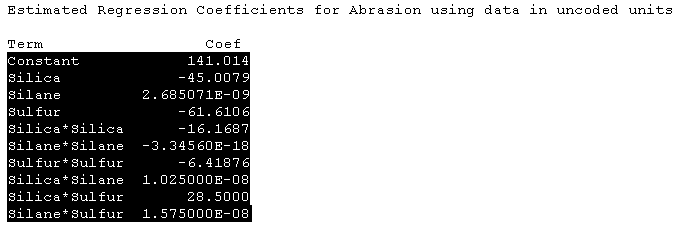 To obtain the effects table from Minitab, first perform the response surface analysis. Find the section shown below that is titled: "Estimated Regression Coefficients ... using data in uncoded units". It is important that it be in uncoded units. Highlight the rows containing coefficients starting with the one labelled: Constant. Copy this to the clipboard by selecting Minitab's Edit-Copy menu item or by pressing Ctrl+C keystroke combination. It is now ready to be pasted into the Paste Equation dialog box.