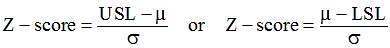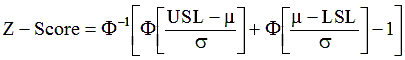 For two specification limits, the Z-score is calculated in order to maintain the same relationship between the Z-score and defect rate shown above. Its formula is: