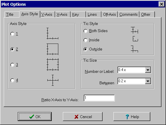 The Axis-Style tab of the Plot Options dialog box is used to customize the axis style, tic marks and aspect ratio of the plots. The controls are: