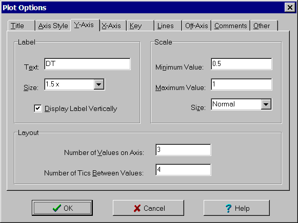The Y-Axis tab of the Plot Options dialog box is used to customize the label, scale and layout of the Y-Axis on the left of the plot. The controls are: