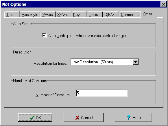 The Other tab of the Plot Options dialog box is used to specify whether to auto scale and for selecting resolution. The controls are: